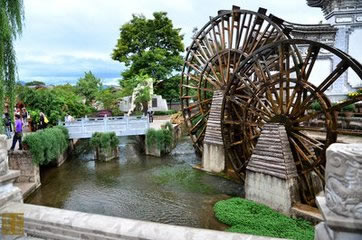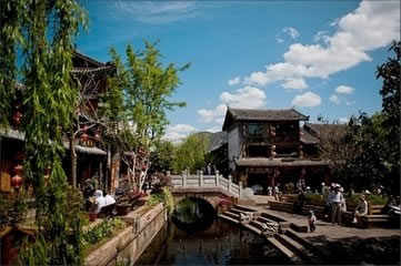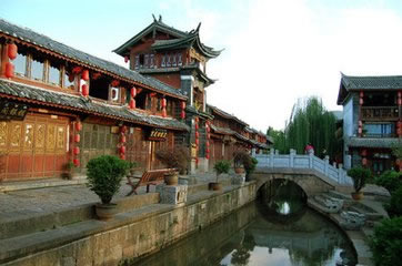 四方街幽深的街巷,青石铺就的道路两边,所有的房屋全是砖木结构。门窗栏栋、斗拱飞檐大都雕刻着花鸟虫鱼、飞禽走兽的花纹。这城市本身就是座公园,小桥流水、树木花朵。耳闻玉笛铜萧的悠扬,或黄鹂栖翠柳的鸣唱;它与中国古代那种普遍的有城墙的城市不同;除了木王府四周有围墙外,丽江是中国唯一不设防的古城。人们可以从四面八方通过街道、小路、巷子、田野甚至山上的羊肠小道进入这个城市。四方街丽江是一个日日夜夜和淙淙流水相约的城市,就像威尼斯那样。不过大研镇的水道,是经过设计用人工挖掘的。原始的河流只有一条,就是穿城而过的中河,从中河又人工开发出西河和东河,分为三支,像一棵大树的主干和两个支干。从它们又生出无数的小渠。居民们甚至可以直接饮用这泉水。四方街是一个梯形的小广场,建造时被设计得中间稍微凸起,两边凹下,犹如一片巨瓦。