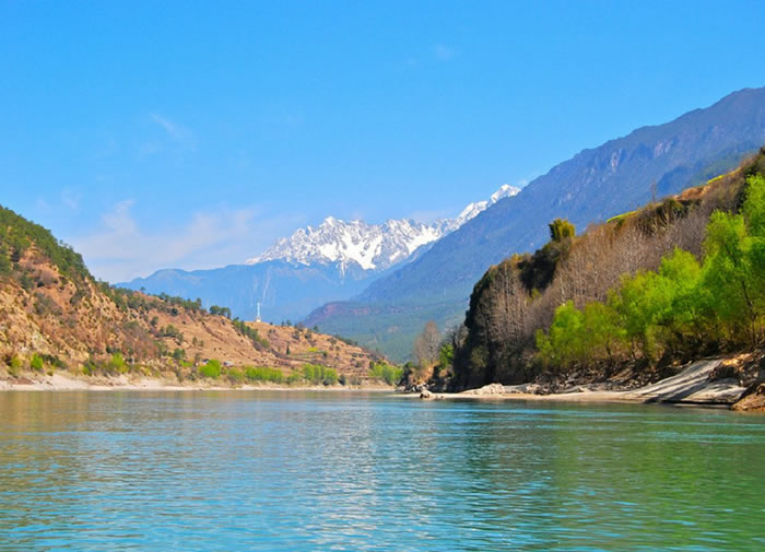 位于云南省西北部的迪庆藏族自治州香格里拉县南部沙松碧村与丽江市石鼓镇之间的长江第一湾,海拔18米,距香格里拉县城130公里,有公路直达。万里长江从“世界屋脊”——青藏高原奔腾而下,巴塘县城境内进入云南,与澜沧江、怒江一起在横断山脉的高山深谷中穿行形成了“三江并流”的壮丽景观。到了香格里拉县的沙松碧村,突然来了个100多度的急转弯,转向东北,形成了罕见的"V"字形大弯,“江流到此成逆转,奔入中原壮大观”,人们称这天下奇观为“长江第一湾”。