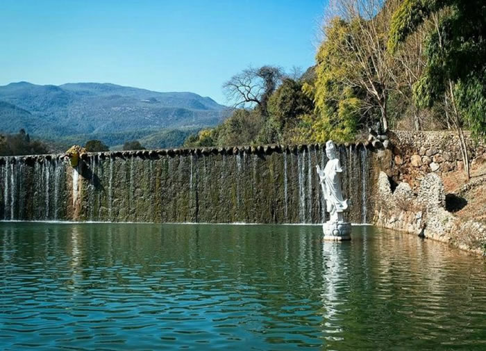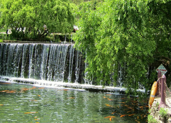 青山抱玉。玉水寨景区位于玉龙雪山南麓、丽江城北十余公里,是丽江坝的主要水源地之一。整个景区东、西、北三面,是常年郁郁葱葱的青松山林,南面朝丽江坝子倾斜,景区北端一道山崖下,两株被列入云南古树名录的千年古树,枝叶繁茂,双树成林。古树下一股流量为每秒0.5立方米的清泉喷涌而出,带着水花向南流,注满一个又一个玉水潭,形成三叠水瀑布群。