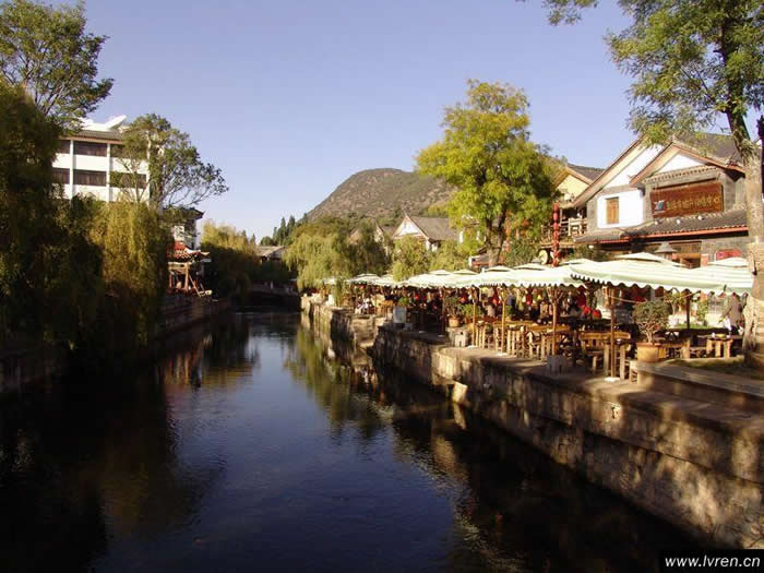 大理古城简称叶榆,又称紫城,其历史可追溯至唐天宝年间,南诏王阁逻凤筑的羊苴咩城(今城之西三塔附近),为其新都。现在的古城始建于明洪武十五年(公元1382年),方圆十二里,城墙高二丈五尺,厚二丈。东西南北各设一门,均有城楼,四角还有角楼。解放初,城墙均被拆毁。1982年,重修南城门,门头“大理”二字是集郭沫若书法而成。 由南城门进城,一条直通北门的复兴路,成了繁华的街市,沿街店铺比肩而设,出售大理石、扎染等民族工艺品及珠宝玉石。街巷间一些老宅,也仍可寻昔日风貌,庭院里花木扶疏,鸟鸣声声,户外溪渠流水淙淙。“三家一眼井,一户几盆花”的景象依然。古城内东西走向的护国路,被称为“洋人街”。这里一家接一家的中西餐馆、咖啡馆、茶馆及工艺品商店,招牌、广告多用洋文书写,吸着金发碧眼的“老外”,在这里流连忘返,寻找东方古韵,渐成一道别致的风景。