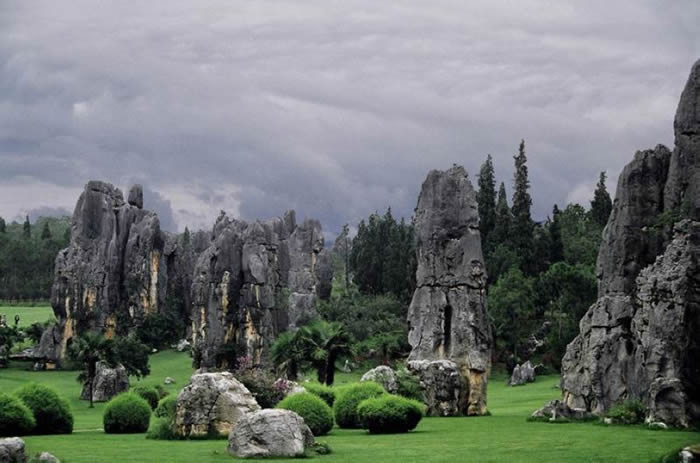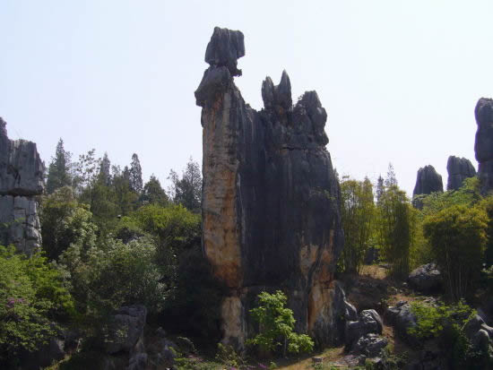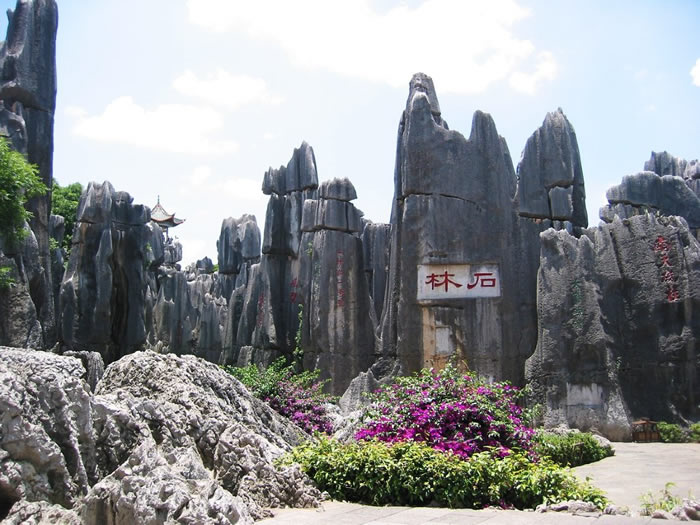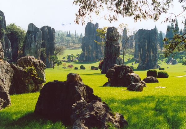 云南石林世界地质公园位于云南省昆明市石林彝族自治县境内,占地总面积400平方公里,海拔1500米—1900米之间,距省会昆明78千米,素有“天下第一奇观”“石林博物馆”的美誉,有现代肖草《重上石林》诗:“挥剑指天穹,坐骑舞亘龙。欲跃蓬阁上?何景不尽穷。”对石林景观做了较为生动、形象的描述。诗中不仅赞美石林地质公园拥有世界喀斯特地貌的精华,被誉为“天下第一奇观。以石成林,形态各异,有仿佛擎天石柱,似乎神圣挥剑直指苍穹;有透迤群山的一丛丛峰林,好似正在舞动的一条亘龙;有参差的峰峦,又如仙人在蓬莱仙岛聚会,各种风景尽收眼底,美不胜收。也是首批中国国家重点风景名胜区、中国国家地质公园、世界地质公园,与北京故宫、西安兵马俑、桂林山水齐名,成为中国四大旅游胜地之一。
