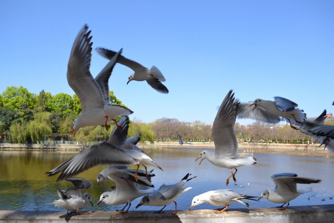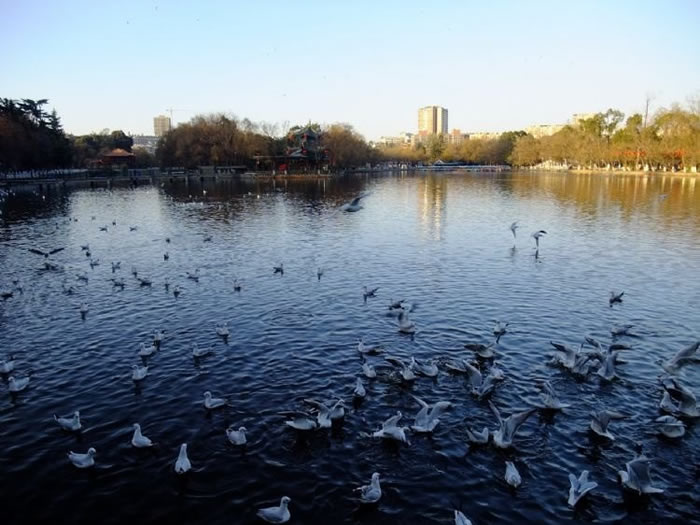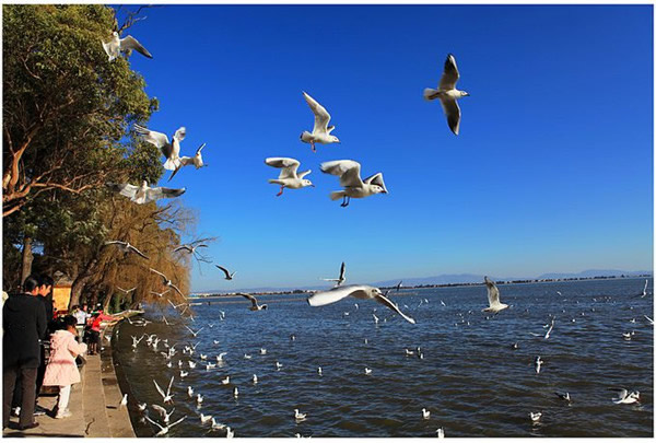 园内,纵贯南北的阮堤(1834年云贵总督阮元拨款所筑),直通东西的唐堤(1919年由时任孙中山的滇川黔三省建国联军总司令的唐继尧拨款所筑),将翠湖分成五片景区;湖心岛景区以湖心亭和观鱼楼等清代建筑为主;特别值得一提的是,自1985年起,每年冬季都有大量海鸥从西伯利亚飞到昆明过冬,其中就有一部分在翠湖栖息。这也充分说明了昆明的四季如春。 到翠湖游览,您可乘1路公共汽车在云南大学站下车,或乘101路在翠湖下车,也可乘5路、23路、4路等公共汽车在小西门站下车步行前往。