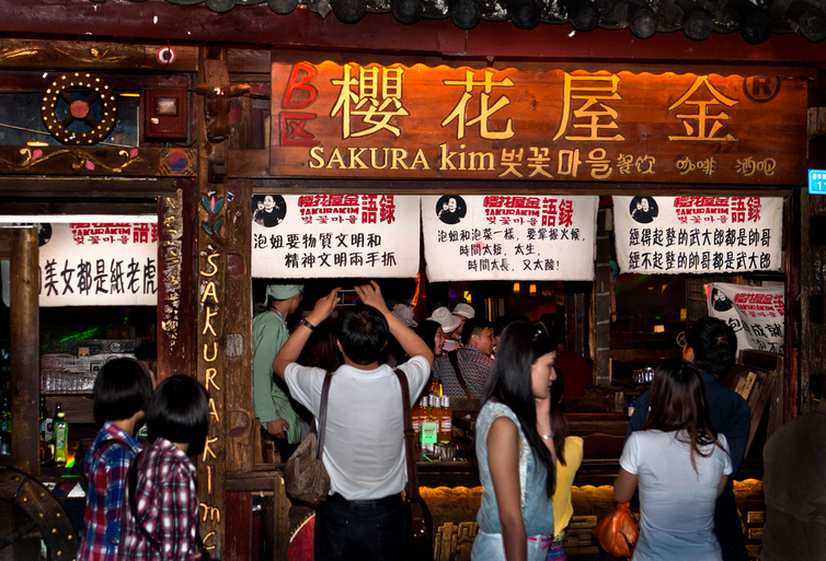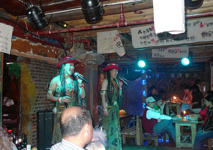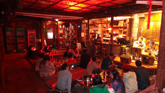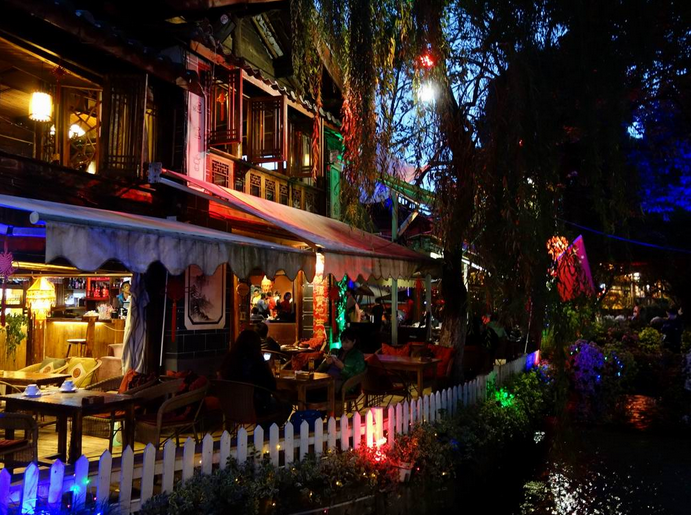 丽江酒吧大体可以分两类,俗称闹吧,一类热烈外露,喧闹活泼,以酒吧一条街为代表;一类低调隐蔽,特立独行,以大大小小分布在丽江古城各处的火塘吧和清吧为代表。丽江古城酒吧一条街一头连着四方街,一头通向古城入口大水车,是古城最繁华的所在,中间流水潺潺,杨柳垂枝,流水两边就是各个在丽江颇具名气的酒吧。白天这里很安静,流水、鱼群、杨柳、老街、三三两两的行人,完全就是一副小桥流水人家的宁静景致,导致你很难把酒吧一条街这样喧闹的名称和它联系起来。
