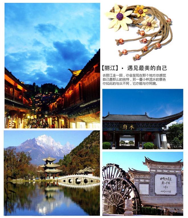 丽江景区:丽江古城、四方街、大水车、纳西壁画、大研镇、玉龙雪山、云杉坪、甘海子、白水河+蓝月谷或束河古镇、黑龙潭。