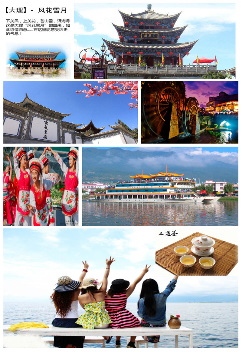 大理景区:大理古城、洋人街、崇圣寺三塔、蝴蝶泉、洱海游船、三道茶歌舞、南诏风情岛
