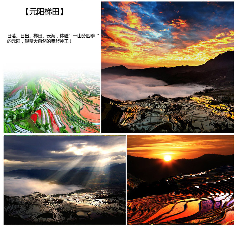 早餐后,游览元阳申报申报世界遗产的元阳梯田核心区之二——多依树梯田(27公里、行车1小时,观日出及云海最佳,需早起)世界遗产核心景区,多依树景区包括多依树、爱春、大瓦遮等连片9000多亩梯田,其形状如一个大海湾,星罗棋布的哈尼族、彝族村寨点缀期间,壮美和谐。是游客观看日出最好的地点。返回昆明游览花之城;游览昆明有花之世界只说到昆明不到花之城如到北京不登长城只说,下午18点左右结束行程。