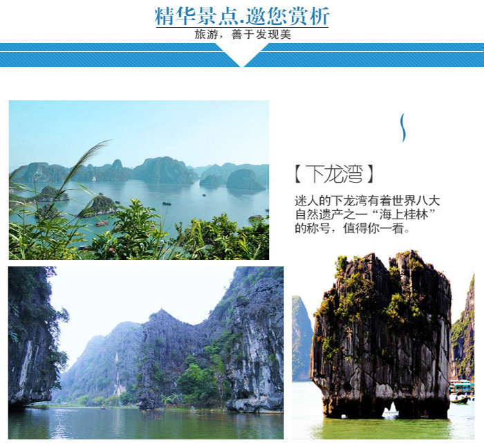 早餐后乘车前往下龙湾(被评为世界八大自然遗产之一“海上桂林”),抵达后乘船参观狼狗石、香鼎山、骆驼石、斗鸡石,并在别有风味的游船上用午餐,途中客人可在海上海鲜市场自费选购海鲜(时间约30分钟),交船家加工(加工费自理),一路感受“船上眺桂林、悠悠赛神仙”的意境。继续乘船前往吉婆岛,抵达后,吉婆岛海滩上自由活动,品味海滩拾贝、沙滩弄潮的乐趣,入住酒店。